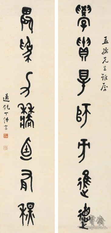 據題跋所示,作品乃是丁佛言為孟孺先生所作。丁佛言,山東黃縣人,名世嶧,以字行,號邁鈍,古文字學家,善籀篆,工刻印,從二十世紀二十年代起,埋首于斷碑古籍中。所得龜甲、彝鼎、泉璽、陶玉之屬、拓片不下七八千種,潛心研究,造詣極深。留有《說文古籀補補》《續字說》《說文抉微》《還倉室述林》《古璽初釋》《古陶初釋》《說文部首啟明》等著述,為我國古代文字研究做出重大貢獻,一九三一年一月十九日病逝于北京。噩耗傳開,海內外賢達名流敬贈儀幛、挽聯,《大公報》發表社論《悼丁佛言先生》,推崇其人品、氣節、學問,稱之為『一代之范』。通觀此作,結體均勻安整,圓中寓方,挺拔絕倫,這源于他深厚的古文字功底,既專功三代鐘鼎彝器,又肆力于石鼓文,為其博雅多姿、流暢樸厚的書風奠定了基礎。識者評其書風曰:所書金文凝重古樸,納奇斜于規矩,寓險奇于平正,于端莊中別含風韻,時有『金剛杵』之譽。